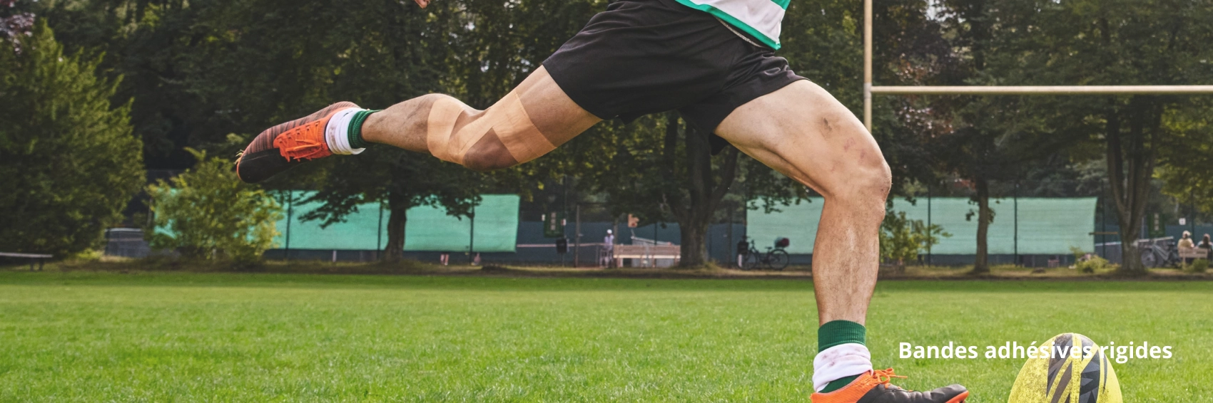 Un joueur de rugby en mouvement frappe le ballon sur un terrain. Elle porte un bandage adhésif élastique sur son genou, illustrant son utilisation pour le soutien des articulations pendant l'activité physique.